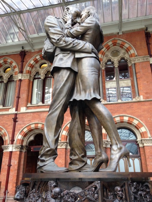 Suffice to say if anyone asked me if say I knew St Pancras station I’d definitely say yes. So when my friend suggested we killed the last 5 minutes before our respective trains by exploring the upstairs of the station I didn’t think much of it. We went up to the second floor via a lift near the bookshop and came out onto a concourse near the booking office. There was a restaurant/bar there and we could see the original features of the beautiful building. So far so expected. Then something caught my eye. It was something that I had never noticed before in all the times that I have been in that station; a humongous statue of lovers kissing. When I say it was huge, I mean it is gigantic in its proportions. At my full height I didn’t come up to the top of the pedestal that it was sat upon. I was in awe. I felt compelled to go up to it, to touch it. I was stunned that this beautiful and enormous piece of artwork was there, all this time and I’d never ever noticed it.